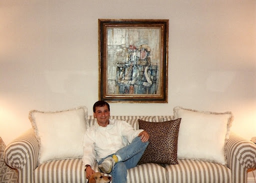 My oh so young husband Ben on the striped sofa with the accent pillow. He's petting Reggie, who was run over a few months after this picture was taken. :( The oil painting came from my mother.