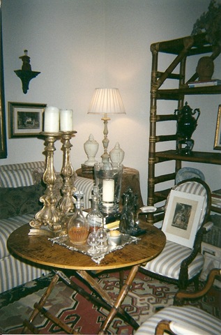 This pictures was taken a few years after we moved in our new home in Houston. I can tell, because I've already gotten rid of the ethnic skirt and replaced it with a paisley shawl. Also, the white pillows are now long gone. That's my cat Quilty sleeping on a paisley shawl. The opaline collection has grown a little. That's an opaline lamp that I had bought at my mother's antique store she had. The lamp has since broken in pieces!!
