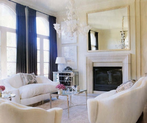 The extra high ceilings allow the silk drapes and chandelier to take center stage in the living room. The antique Venetian fixture was bought from the estate of one of the founders of the Pebble Beach Golf Club. The vintage 1940s style French sofas and chairs were purchased from Watkins Culver and are covered in white muslin. Mirrored chests flank both sides of the limestone fireplace and the art work above is by Cy Twombly. The rug, from Creative Floorings, of course, is Tibetan.
