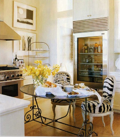 I adore this kitchen! White carrara marble replaced pink granite countertops. French iron top table from Joyce Horn Antiques with Clarence House zebra printed silk velvet covered french chairs.