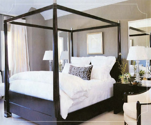 Just about the only pieces that traveled from the highrise were this Baker four poster bed and the Barbara Barry night stands.