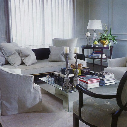 The family room shows the start of the evolution to a more glamorous space. The velvet sofa is from Holly Hunt, the chair and end table are Barbara Barry, and the slipcovered chairs are from Donghia. Mirrored table is from Shabby Slips. Only the candlesticks are familiar from before.