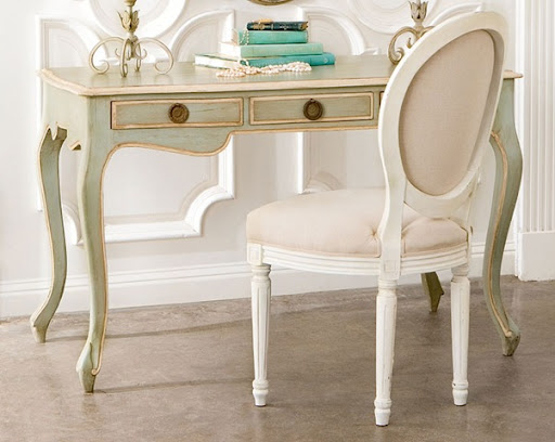 Wisteria's new French styled chair is one of my favorites - a bargain at just $250. The desk is new too. I love the faux antique station clock - $150.