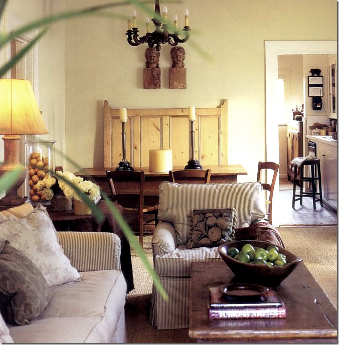 It was this photoshoot in Country House in 2000 that showed a new direction for Ginger. Suddenly, her interiors were markedly clean lined and highly edited. She also introduced several new pieces of antique furniture that added so much – like this wood bench and a armoire. This was the magazine shoot that I drooled over for years. I love how she styled her rooms and I loved her accessories, like these lamps. The difference between this photoshoot and the previous ones is that this one showed a new, much more sophisticated aesthetic. Notice the two busts above the bench. They show up in the new townhouse.