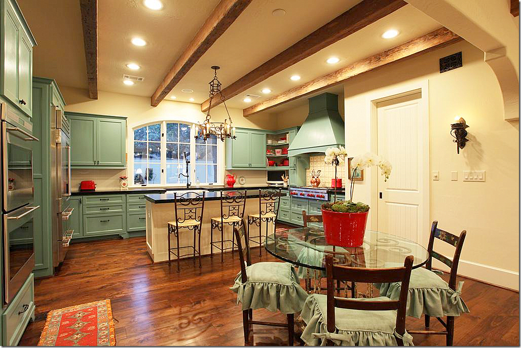 BEFORE: The kitchen has really changed as you can see here – today the island is twice the size making the space seem larger. The turquoise cabinets were painted gray, which make a huge difference. Again, I don’t really care for the furnishings, especially compared to today’s.